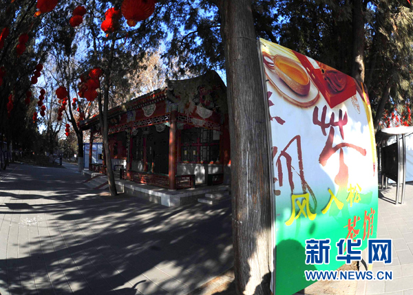 在地坛方泽坛附近,记者看到一间古建筑“变身”的叫做“风入松”的茶室,据附近的工作人员介绍,这家茶室平时不营业,从除夕开始营业。茶室门上悬挂着“凤懿”的匾额,古色古香。