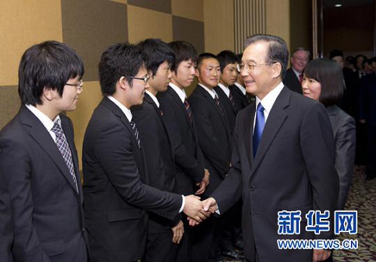 5月21日,中国国务院总理温家宝在东京会见日本上智大学学生代表。 新华社记者黄敬文摄