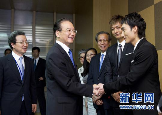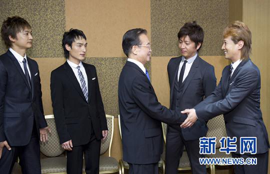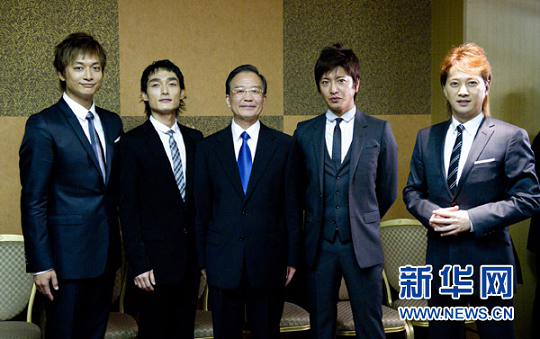 5月21日,中国国务院总理温家宝在东京会见日本知名流行演唱组合SMAP成员。 新华社记者黄敬文摄