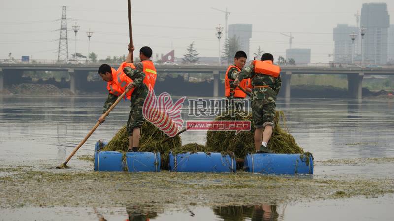 5月22日下午,临沂市武警支队和消防支队的官兵150余人来到祊河中水草最严重的区域帮助园林局工作人员打捞水草。