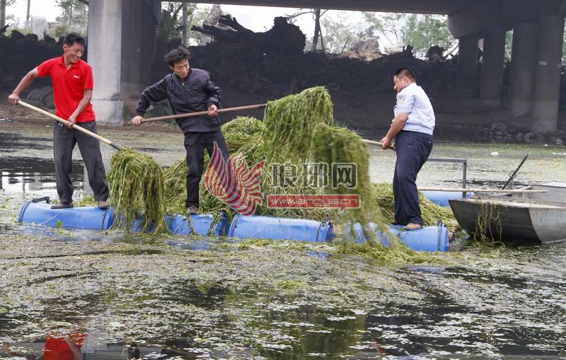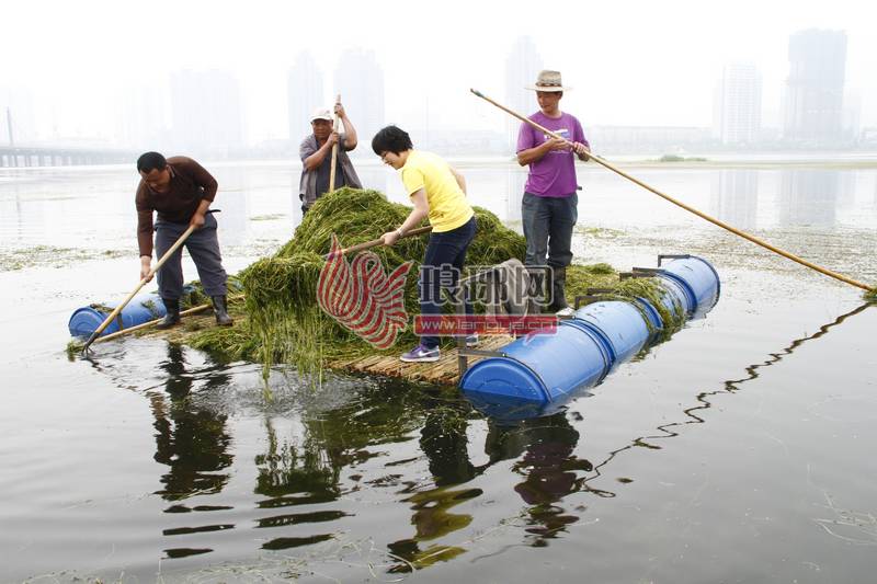 打捞水草这么费劲,难道就不能用别的办法了?园林局的工作人员告诉记者,祊河的水是临沂市的储备用水,是不能污染的,所以不能喷洒药物,只能用人工的方式去打捞水草了。