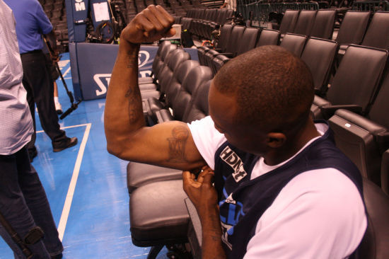 记者在西部第二轮的时候看到,德克和巴特勒的衣柜上贴了一个总冠军奖杯的图片,后来,越来越多的人加入了这个活动,特里、海伍德等人也如法炮制。谈到这件事时,喷气机说:“我们从杂志上剪下了总冠军的图片贴到衣柜上。我还有一个总冠军奖杯的纹身,”特里边说边挽起右臂的袖子展示给大家看。“赛季开始前纹的,我是唯一纹身的人,他们都说我疯了。”特里咧着嘴笑道。
