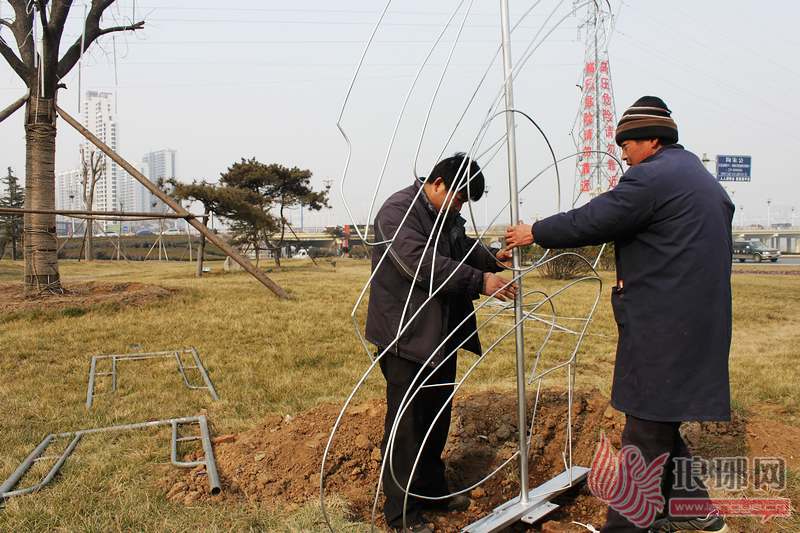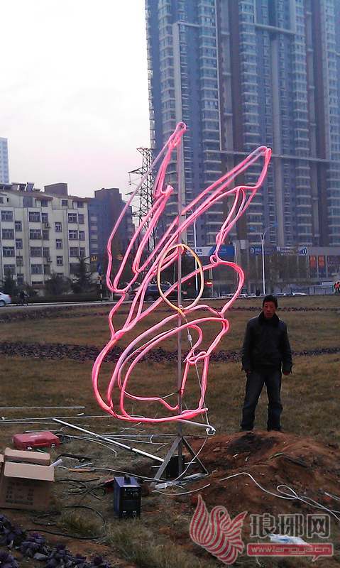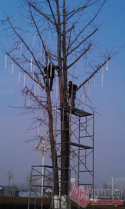 工作人员正在安装立体造型灯。