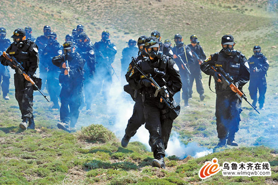 5月22日,特警飞虎突击队成立一周年之际,作为维护乌鲁木齐市政治、社会稳定的拳头和尖刀力量,飞虎突击队在天山牧场举行应急处突演练。