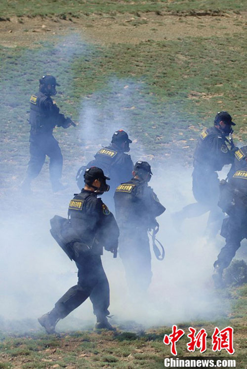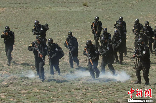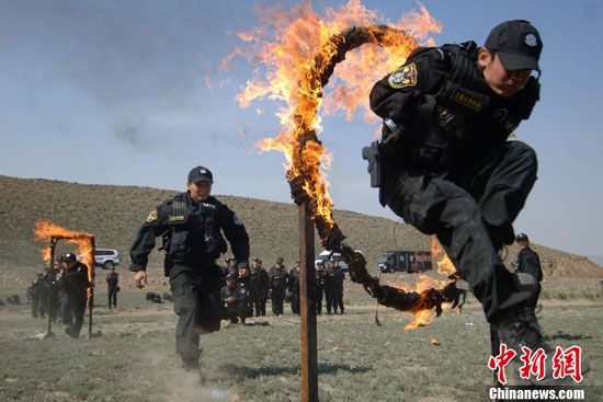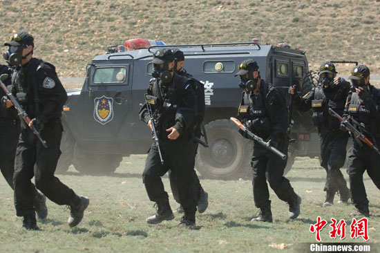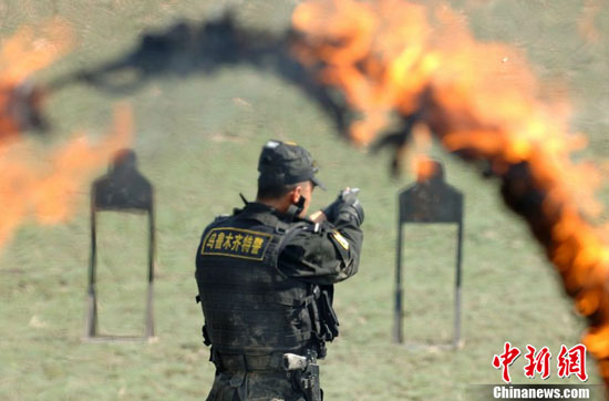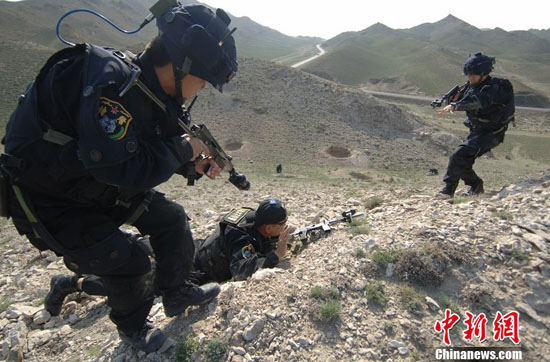2011年5月22日,新疆乌鲁木齐市公安局特警支队“飞虎突击队”在野外进行处突演练。这是“飞虎突击队”成立一周年的一次综合检阅,也是为今年在乌鲁木齐市举行的首届中国——亚欧博览会做好安全保卫工作。马元 摄