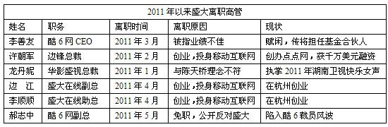 不过,进入到2010年下半年后盛大扩展的步伐明显变慢了,关于盛大整合资源的各种消息不断。进入2011后更是进入爆发期。酷6创始人李善友离职、边锋总裁许朝军相继离职,华影盛视总裁龙丹妮挂印而去,盛大空降高管到盛世骄阳接替徐蕾蕾担任CEO。最近酷6裁员20%更是将这一调整推向高潮。