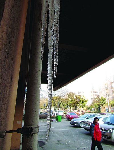 昨天上午,南京后宰门附近一根水管因天气寒冷而爆裂,水管里漏出的水一夜间变成几根冰凌。徐福庚 范晓林 摄