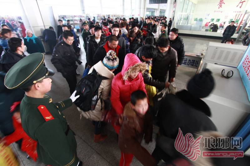 1月28日,在临沂市长途客运总站,旅客在通过安检。民间素有“三六九,往外走”的说法。昨天,探亲客流集中返程,进城务工人员也纷纷启程,我市各大车站迎来春运返程高峰。