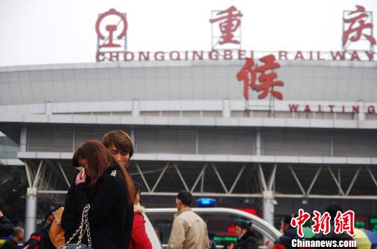 重庆龙头寺火车站候车大厅前,一对即将分别的情侣。