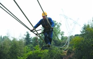 5月21日,安徽送变电公司工人在黄山黟县施工。22日,黄山电网首条500千伏超高压输电线路全线贯通,将缓解黄山地区电力需求。新华社记者 李健 摄