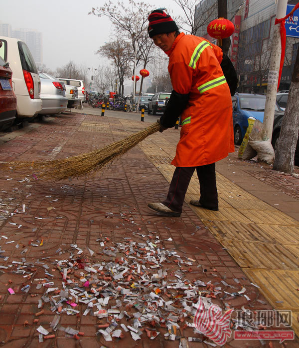 “开门炮”响声阵阵,报出了新年的开门红,也留下了大量的碎纸屑,为了清理它们,可累坏了环卫工人师傅们。上午11时许,在八一路广场至启阳路段记者看到,道路两旁簇着一堆堆鞭炮纸屑,负责该路段卫生的环卫工人赵梅师傅告诉记者,商家只管燃放鞭炮,清理全落到了环卫工人身上,从早上4点钟到现在,她就一直没停歇过,刚扫干净了,又有人放鞭炮,又得扫,短短几百米的路段,她不知扫了多少遍。眼看到中午了,赵师傅才把这些聚堆的鞭炮纸屑清理到垃圾箱里。“过年这几天,我就没歇过,今天最累了,身上的棉袄都被汗水浸透了……”赵师傅靠在三轮自行车上,一手握住扫帚,一手擦拭着额头上的汗珠说道。