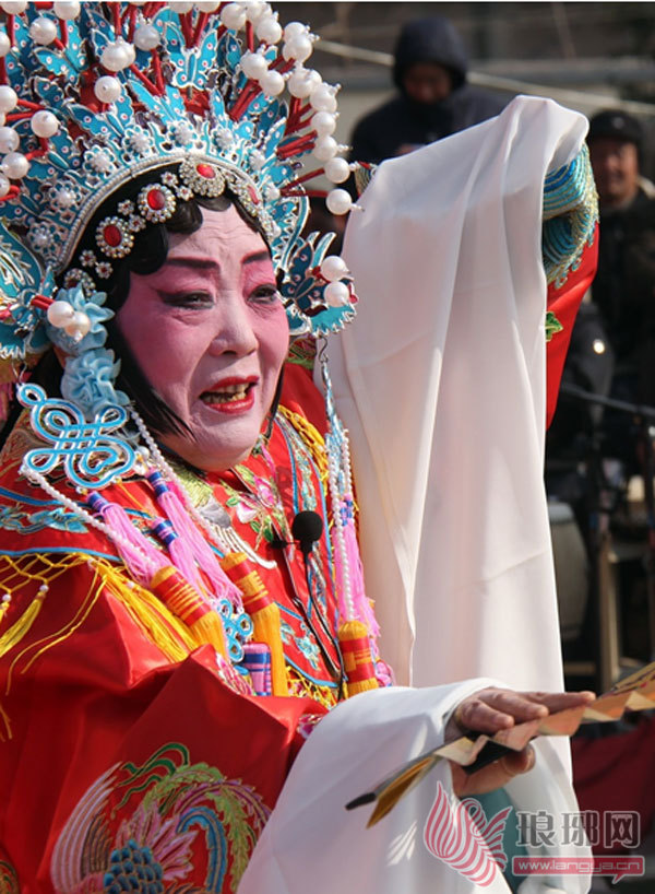 在郯城县人民广场,演员为群众表演京剧《贵妃醉酒》选段。