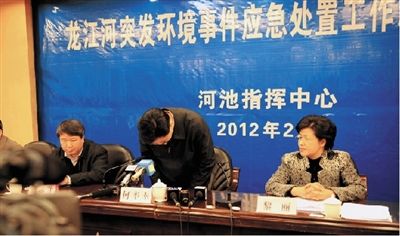 2月1日,在广西河池市举行的龙江河突发环境事件应急处置工作新闻发布会上,河池市市长何辛幸向公众道歉。新华社发