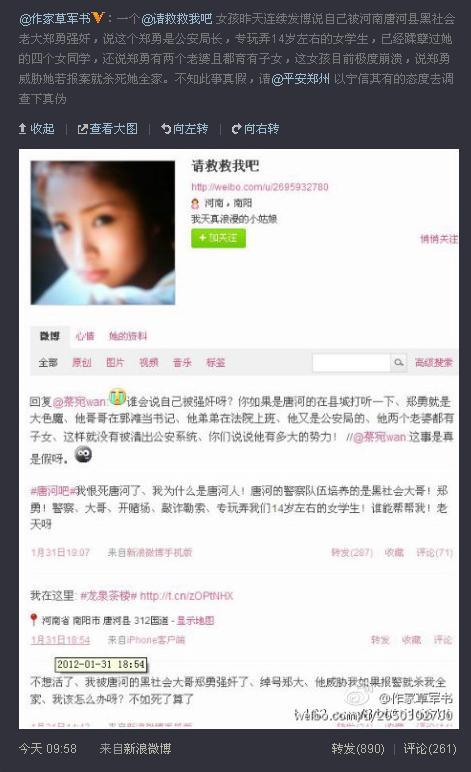1月31日晚上9点,网友“请救救我吧”频发微博说“自己被唐河的黑社会大哥郑勇强奸、专玩弄我们14岁左右的女学生”等向网友求助。并说郑勇为当地公安局长、开赌场、敲诈勒索,已有好几个同龄的女同学遭此人毒手。