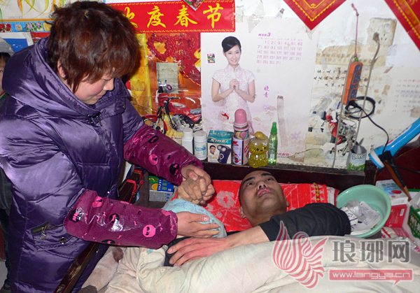 乔景光出院后,王永芳每天早晨不到5点就要起床,伺候丈夫洗刷后,还要给丈夫和儿子做饭,等喂完丈夫后,她再到村子附近的工厂打工。2007年5月,乔景光的父亲离开了人世,这对乔景光来说无疑又是一个巨大的打击。由于过度悲伤,乔景光的颅内压突然增高,又做了第四次手术。“当时做了颅内压分流手术,从那以后他就站不起来了。”王永芳哭着说道。