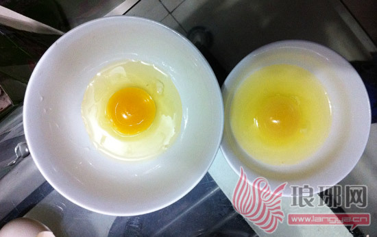为了辨别真伪,田先生找来两个生鸡蛋,一个是老家的草鸡蛋,另一个是“苍马山牌”草鸡蛋,分别打开放在两个碗里。记者发现老家来的草鸡蛋,鸡蛋清的颜色很淡,鸡蛋黄和鸡蛋清能很清晰地分辨出来,而“苍马山牌”草鸡蛋的鸡蛋黄和鸡蛋清颜色都差不多,颜色较重。随后,记者取出三个“苍马山牌”草鸡蛋放锅里煮。待煮熟后,打开鸡蛋,记者看到蛋黄颜色仍较鲜亮,用力捏蛋黄居然能反弹回来,用力将蛋黄扔在地上,发现蛋黄竟然能弹起来。而田先生从老家捎来的草鸡蛋,煮熟后,鸡蛋黄一捏就成粉状,一点弹性都没有。