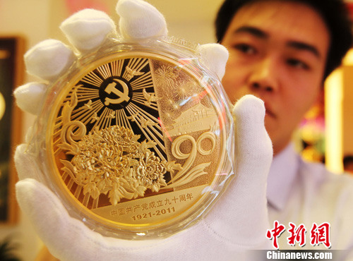 5月18日,河南许昌,纪念中国共产党成立90周年1公斤纪念金章在中国金币河南钱币许昌店开业典礼上亮相,该纪念章重量达1公斤,完全纯金铸造,在当天的报价为50万元人民币。中新社发王中举 摄