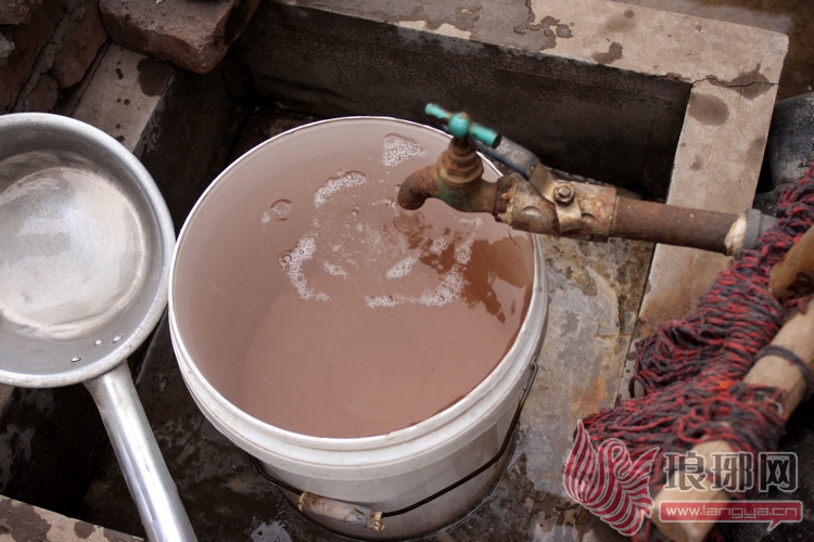 5分钟后,就在记者和村民们困惑的时候,正在接水的塑料桶内却突然呈现出淡淡的红褐色,而且随着水龙头的继续放水,桶内水的颜色越明显,而且还出现了少许泡沫。“你看,这水又变色了,跟前几天的一样。”村民舀起一瓢水,喝了一口,不到两秒钟,马上吐了出来,“这味太大了!”