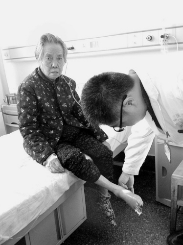 就在一周前,老人的这只脚还淌着血水。事实上,老人的脚病早在半年前就发作了。那时,右脚经常无缘无故破皮,破了好,好了再破。到后来,这只脚还整夜整夜地痛,大把大把地吃止疼药挺着。住院前,这些招法不管用,老人只能改抱着揉脚了。春节前,女儿曾带她到解放军463医院看病。当时,介入科钱钧主任叫其入院手术,被老人当场拒绝,理由简单,“老话说了,春节不能在医院过,否则不吉利。”就这样,节后第一天上班,吴老太太在家人陪同下来到医院治疗,而此时,老人的右脚趾已经烂成了树枝样……