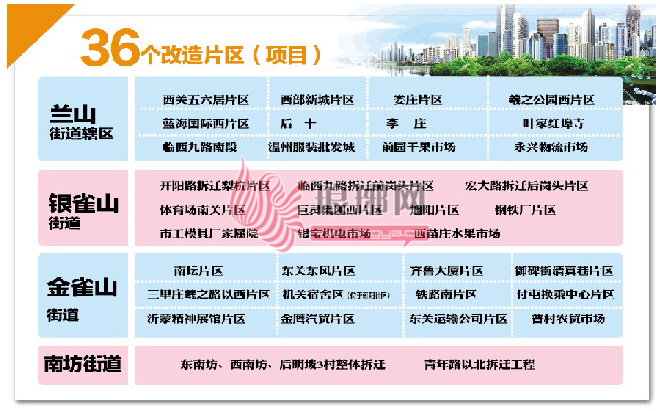 按照地域划分,36个改造片区(项目)分布在兰山、银雀山、金雀山和南坊4个街道办事处。兰山街道辖区有12个改造项目,分别为西关五六居片区、西部新城片区、娄庄片区、羲之公园西片区和蓝海国际西片区,后十、李庄和叶家红埠寺3村也列入改造计划,同步改造的还有临西九路南段、温州服装批发城、前园干果市场和永兴物流市场4个拆迁工程。