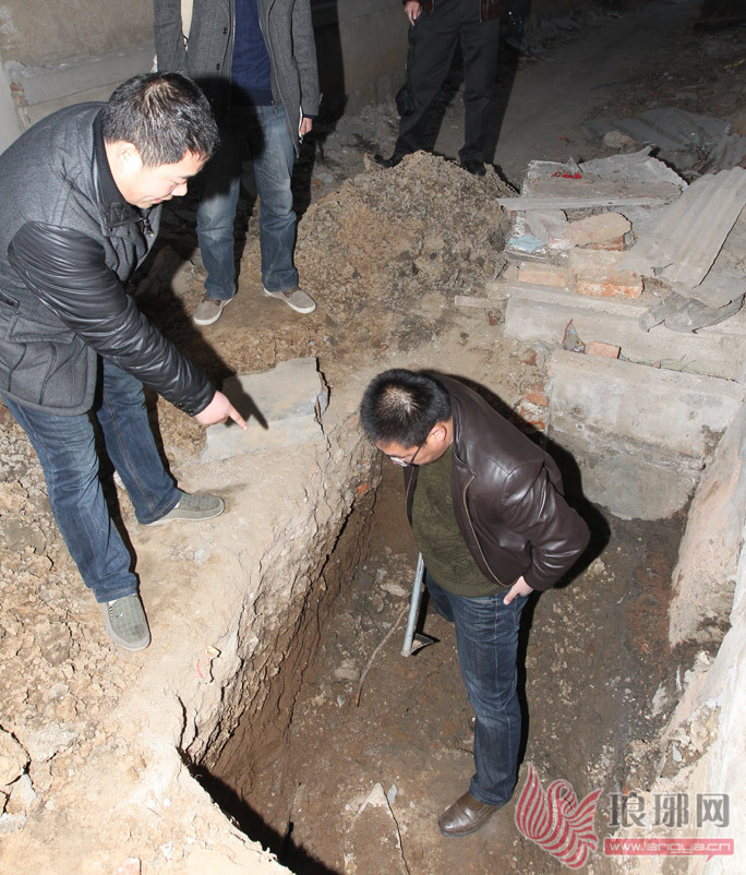 9日晚6点多,文物专家在查看古墓情况。
