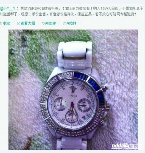 网上公布的13张图片,包括1张@小Y __Y介绍“老公挂名不上班”的对话截图、12张自拍照和奢侈用品照。这些奢侈品包括各式各样的名牌手表、皮包、香水、鞋子、手机、打火机,其中一款V E R SA C E钻石男式手表价值15万元,一款从巴黎买的黑色女式皮包价值14900元。