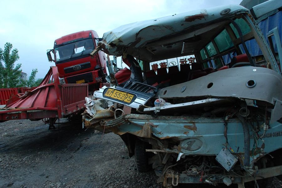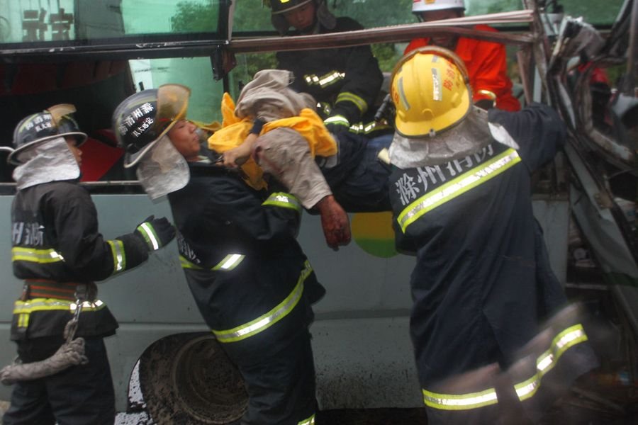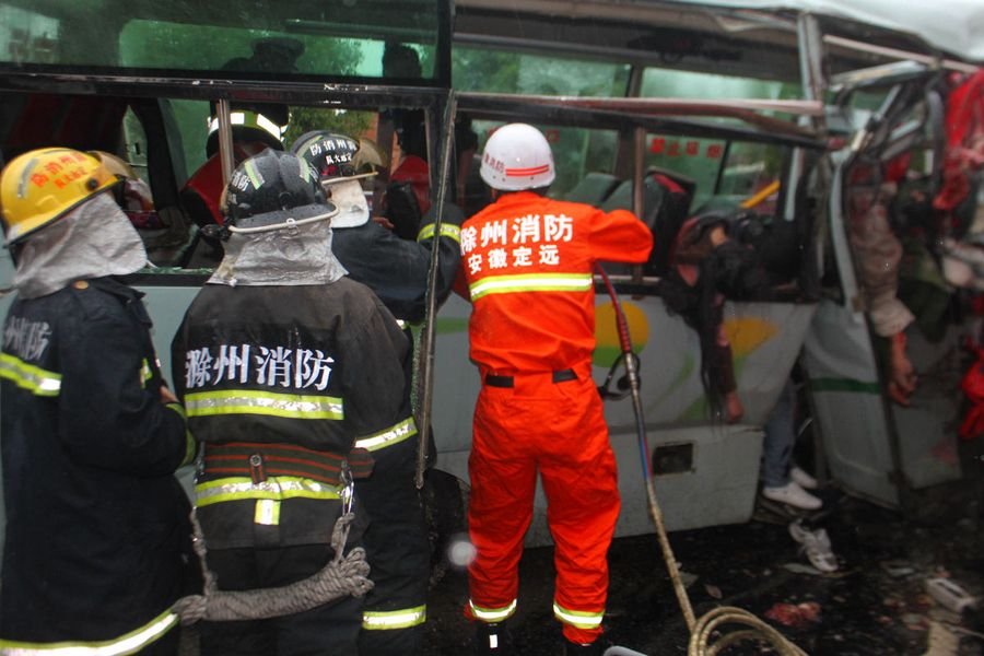 5月22日,消防官兵在安徽省道S101线定远县张桥镇段的事故现场对伤者实施救援。5月22日17时06分左右,安徽定远县张桥镇境内省道S101线一辆中型半挂大货车与一辆中型客车发生正面相撞。事故已造成6人死亡,11人不同程度受伤。据一名当事人介绍,死者多数是郭集中学的老师。