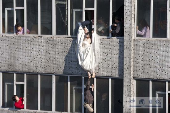 2月10日,第55届世界新闻摄影比赛(荷赛)评选结果在荷兰揭晓,3名中国摄影师在此次比赛中获奖。摄影师李杨拍摄的照片《跳楼新娘》获得热点新闻类单幅三等奖。这张照片说明为“2011年5月16日,人们在吉林长春一栋居民楼解救一名身着婚纱意欲跳楼轻生的女子”。新华社发(李杨摄)