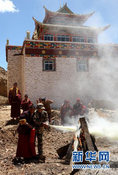 5月8日,却吉尼玛在炉霍县热哈寺被烧毁的小经殿废墟上,教授喇嘛使用灭火器。热哈寺是一所新建寺庙,去年遭遇火灾烧毁了小经殿,幸亏却吉尼玛带领的消防队员及时赶到,才没有殃及大经殿等其他建筑,寺庙对此非常感激。却吉尼玛抓住这个机会向僧侣们宣传消防知识,商讨如何完善寺庙的消防设施。 新华社记者 金立旺