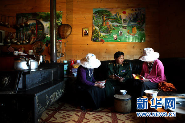 5月8日,在郎珍初(右一)家,却吉尼玛(中)向郎珍初和她的邻居陆珍宣传消防知识。去年发生的一场火灾差点夺去郎珍初和三个孩子的性命。 新华社记者 金立