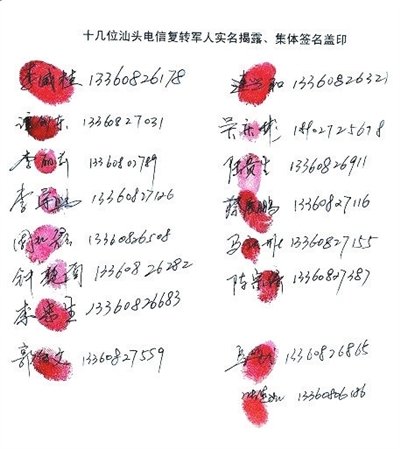 近日,一则名为“广东电信大批购买茅台酒供内部高管吃喝,重大贪腐曝光!”的帖子在网上被广泛转载,发帖人是广东电信汕头分公司的16位员工。这些员工在帖子中称“广东电信每年购买大批量茅台酒供内部高管吃喝”,并张贴了印有“中国电信”标志的茅台酒图片,另外,帖子中还公布了16名汕头电信员工签名、手印和手机号码。很显然,这并不是一般网上经常可见的匿名举报。