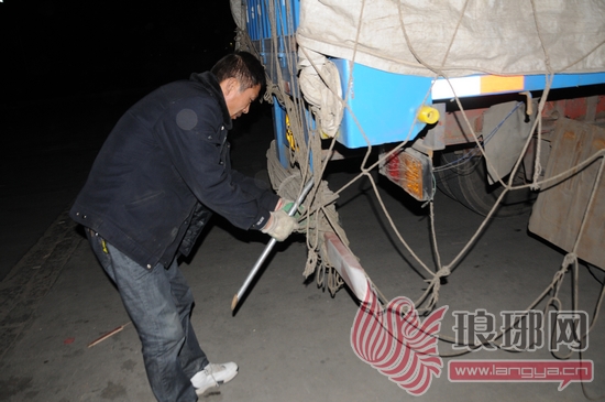 货车司机刘建光用工具加固绳索确保货物不松动。从临沂到青岛途中,类似的检查他做了3次。