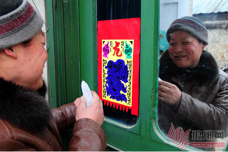 2月21日,郯城县马头镇农民张乃仓在贴“龙笺”。