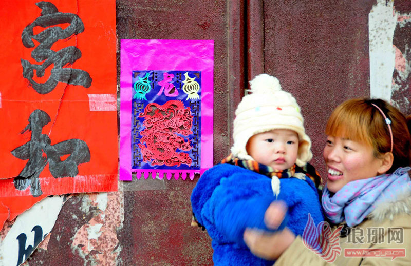 2月21日,山东省临沂市郯城县马头镇一名妇女怀抱孩子在张贴“龙笺”的大门旁玩耍。