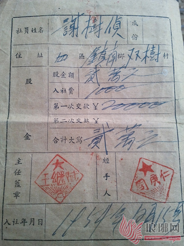 记者看到,这张旧存单为16开大小,表面为土黄色,正面有一个红色的五星,中间写着八个大字“信用合作社社员证”,落款为“临沭县第四区镇南乡信用合作社”编号为“第108号”,存折的日期为1954年12月15日,在存折反面有姓名、住址、股金、经手人等信息。