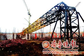 23日中午12时30分许,记者在兰山区李官镇前湖村西侧的云泊湖社区施工现场看到,工地上密密麻麻地矗立着26台大型塔吊,许多工人正在工棚里吃午饭。倒塌的塔吊断裂处位于塔吊底部三米处,一段高30多米的黄色塔吊“躺”在地上,吊臂和操作室掉落至地面,操作室已严重变形,操作室玻璃破损严重,正在施工的楼房墙壁被倒塌的吊臂砸倒。一辆满载木方的大货车停在倒塌的塔吊旁边,地上还散落着施工工人的安全帽。