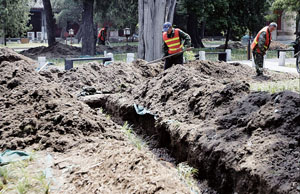 中国园林网5月27日消息:“这是在挖排水沟吗?”昨天,记者在孔庙的院子里发现,有近20名工人在古树的四周挖出了大约50厘米深的坑。工人李师傅介绍,这是在为古树施肥,进行加“餐”。