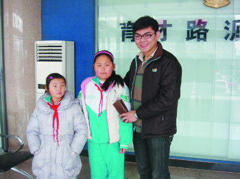 失主王先生和两名拾金不昧的同学在一起。