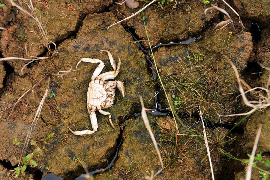 5月25日,江西省新建县南矶乡红卫村,鄱阳湖干涸湖底因前些天的一场雨略显湿润,这只螃蟹却没能幸存。IC
