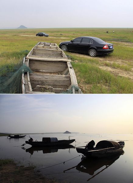 这张拼版照片显示的是:上图为5月25日,当地的私家车辆行驶在江西九江市都昌县鄱阳湖区干涸的湖床上;下图为2010年5月11日在相同地点拍摄的停泊在湖面的渔船。连日来,江西省大部分地区出现明显强降水天气,但严重干旱的鄱阳湖并不解渴,湖床大面积干涸,旱情依然严峻。新华社发(杨帆 摄)