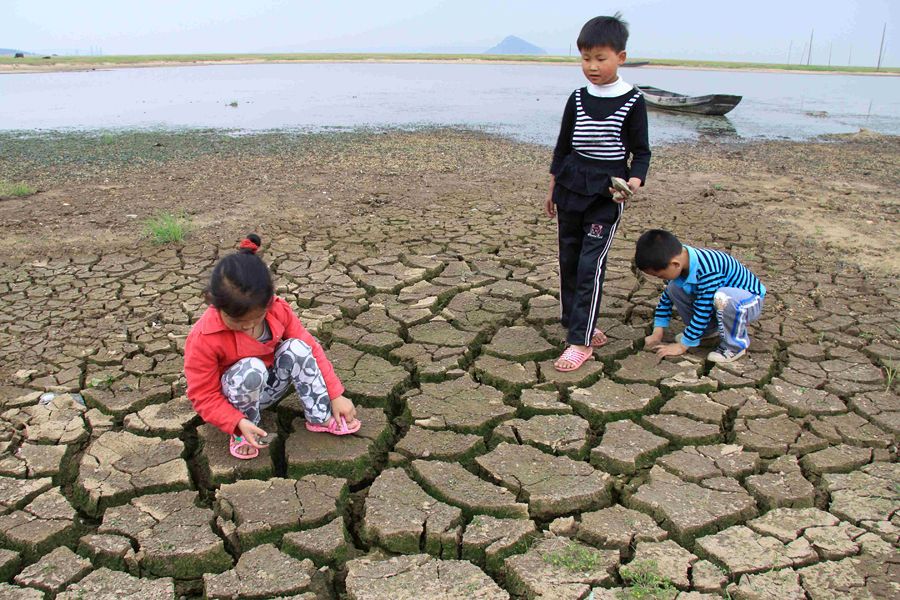 5月25日,在江西省九江市都昌县鄱阳湖区,小朋友在干涸开裂的湖床上捡贝壳。新华社发(杨帆 摄)