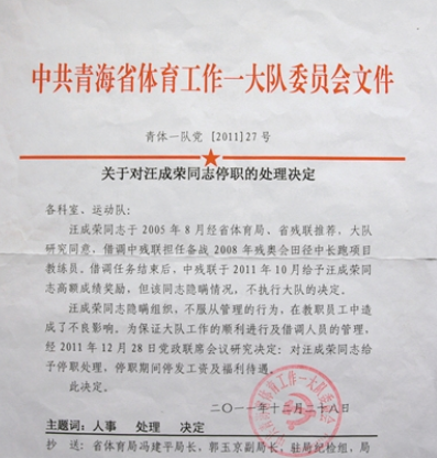 2011年12月28日,青海体工一大队党委下发了《关于对汪成荣同志停职的处理决定》,该文件称:“中残联于2011年10月给予汪成荣同志高额成绩奖励,但该同志隐瞒情况,不执行大队的决定。汪成荣同志隐瞒组织、不服从管理的行为,在教职员工中造成了不良影响。”汪成荣被停职,停职期间停发工资及福利待遇。