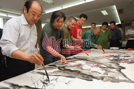笔会上数位画家集体创作巨幅国画《百花齐放》。