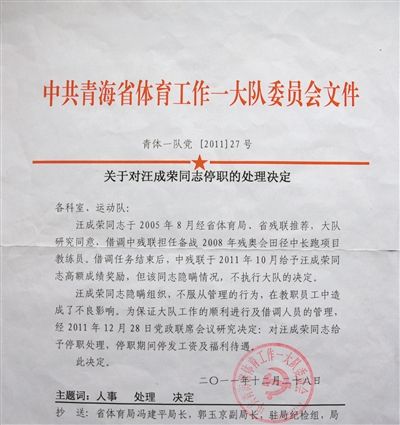 2011年12月28日,青海体工一大队党委下发了《关于对汪成荣同志停职的处理决定》,该文件称:“中残联于2011年10月给予汪成荣同志高额成绩奖励,但该同志隐瞒情况,不执行大队的决定。汪成荣同志隐瞒组织、不服从管理的行为,在教职员工中造成了不良影响。”汪成荣被停职,停职期间停发工资及福利待遇。