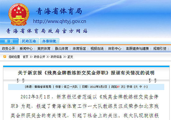 2012年3月1日,新京报记者范遥以《残奥金牌教练拒交奖金停职》为题,报道了青海省体育工作一大队教练员汪成荣参加北京残奥会所获奖金的有关情况,引起了社会上的关注。我大队现就该报道的有关情况做一说明:
