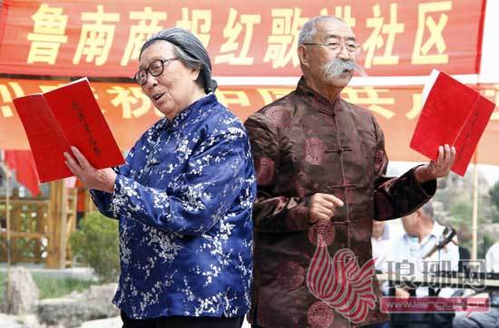 广场红歌队的成员在表演《老两口学毛选》。(资料片) 记者 展萍 摄