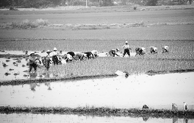 5月27日,湖北省监利县朱河镇的农民在稻田里插秧。一场及时雨过后,遭遇特大干旱的湖北省监利县朱河镇农民抓紧时机,千方百计抗旱插秧保丰收。 新华社记者 李晓果摄