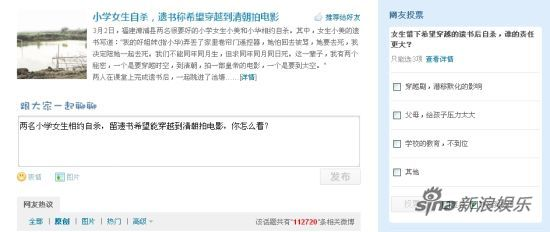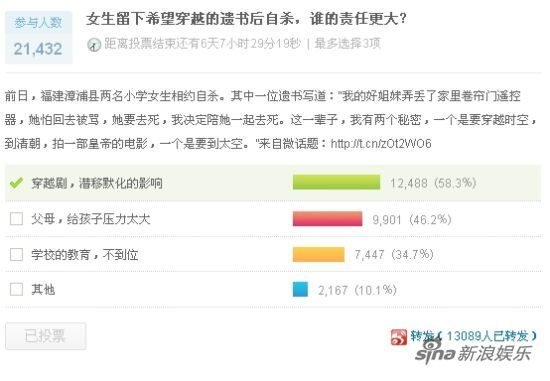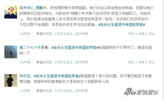针对此事件新浪微博发起了小学生自杀遗书称希望穿越到清朝拍电影的为话题,此话题得到很多网友的关注,截止到今天有十万多条的评论。网友们大多围绕着两位小学生自杀到底是谁之过错展开了议论。有些网友称这都是穿越剧的过错,穿越剧不应该没有科学依据,随意修改历史,即使播出之后也应该写上纯属虚构的字样。