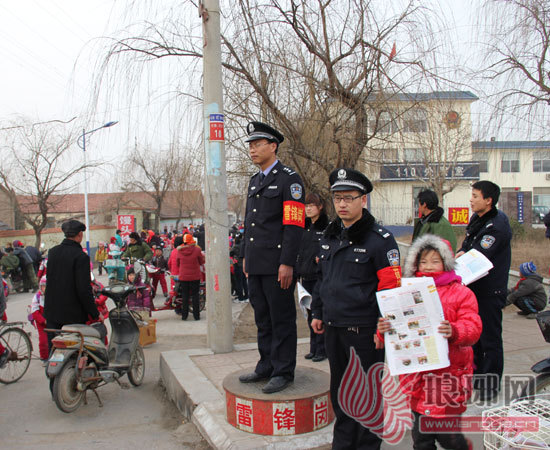 民警在校园门口设立雷锋岗,维持校园安全秩序