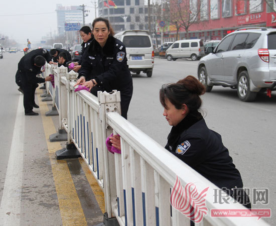 民警走上大街开展“擦护栏甘当城市清洁工”行动